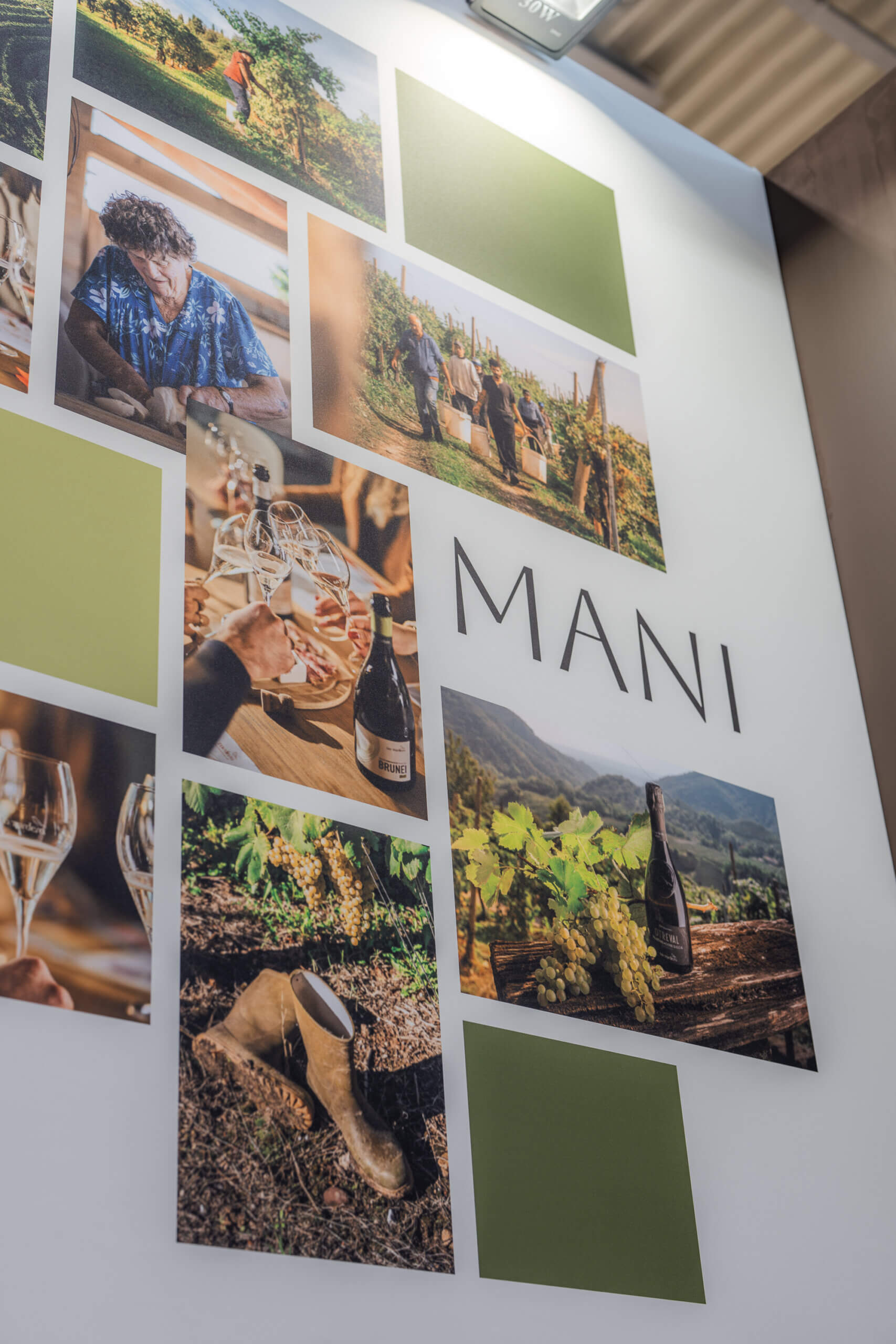 Una parete è stata dedicata alle parole che compongono il manifesto, incorniciate da una serie di immagini che ritraevano i volti della nostra famiglia e gli elementi più rappresentativi del nostro lavoro, per proseguire poi con la frase “Bollicine di famiglia, vini che raccontano la nostra terra” apposta su un’altra parete, affiancata da una fotografia che ritraeva Pietro, Mirella, Renato e Paolo.