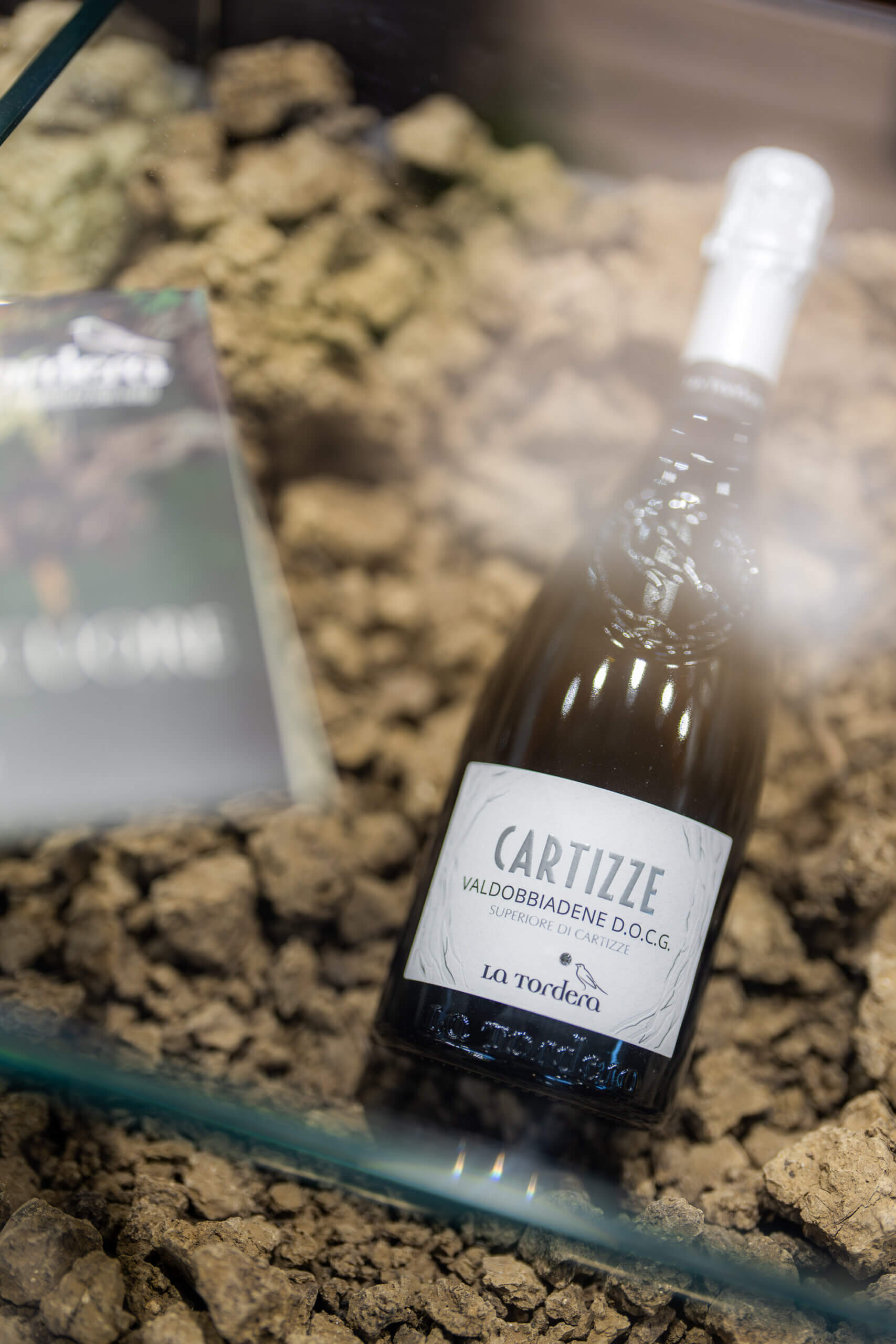 Infine, una parte del banco di mescita dei vini è stato teatro di “Con le mani nella terra”: sono state utilizzate delle teche di vetro per esporre la terra che abbiamo raccolto da tre dei nostri vigneti proprio per concretizzare al meglio il nostro manifesto ma anche per evidenziare le differenze del terreno e le conseguenti caratteristiche organolettiche che ciascun terroir trasferisce al vino.